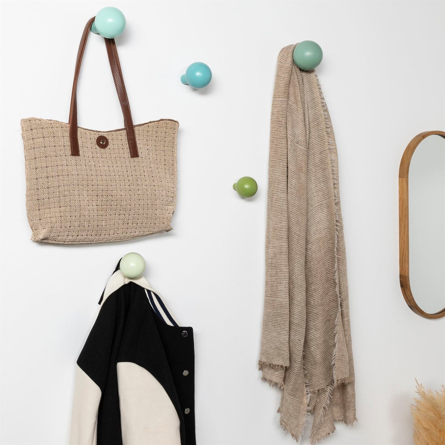 Entdecken Sie das Terra Home Wandhaken Set in Birnenform, bestehend aus fünf designer Wandhaken im modernen skandinavischen Stil. Das Set ist die perfekte Wahl für diejenigen, die Wert auf Qualität, Funktionalität und Ästhetik legen. Die grünen und blauen Töne, kombiniert mit der lackierten Oberfläche, verleihen jedem Raum eine frische, moderne Atmosphäre.