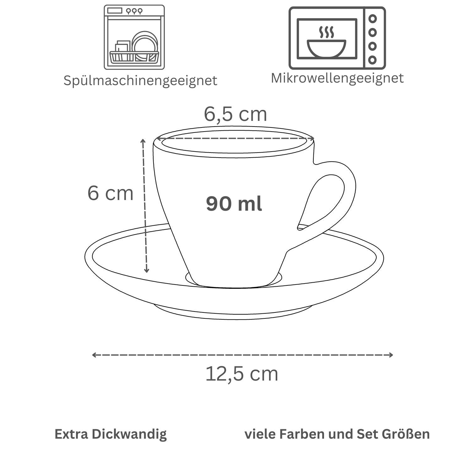 Die dicken Wände der Tasse halten das Getränk besonders lange warm, der Espresso kühlt also nicht so schnell aus. Die passenden Untertassen sorgen für einen sicheren Stand der Tassen. Durch das schlichte Design können diese Tassen auch problemlos mit bestehendem Porzellan kombiniert werden.