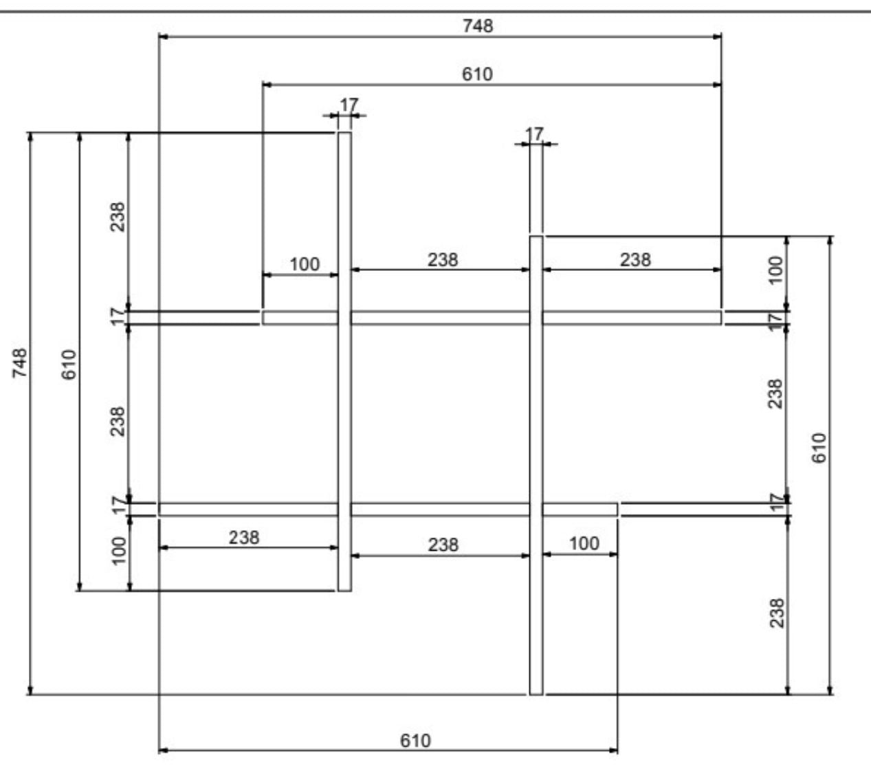 Maße unten: 24x24x15 cm, 24x24x15 cm,10x24x15 cm.